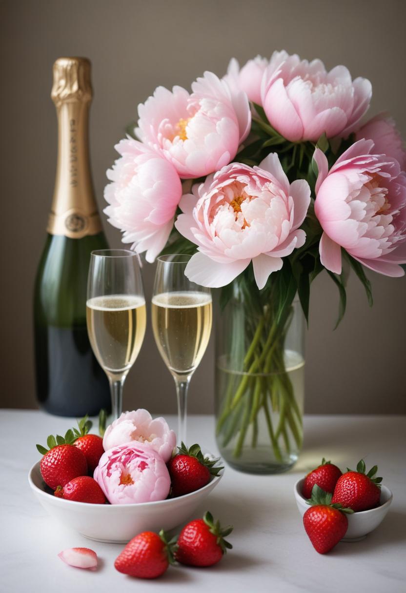 Celebrating with peonies, champagne, and strawberries