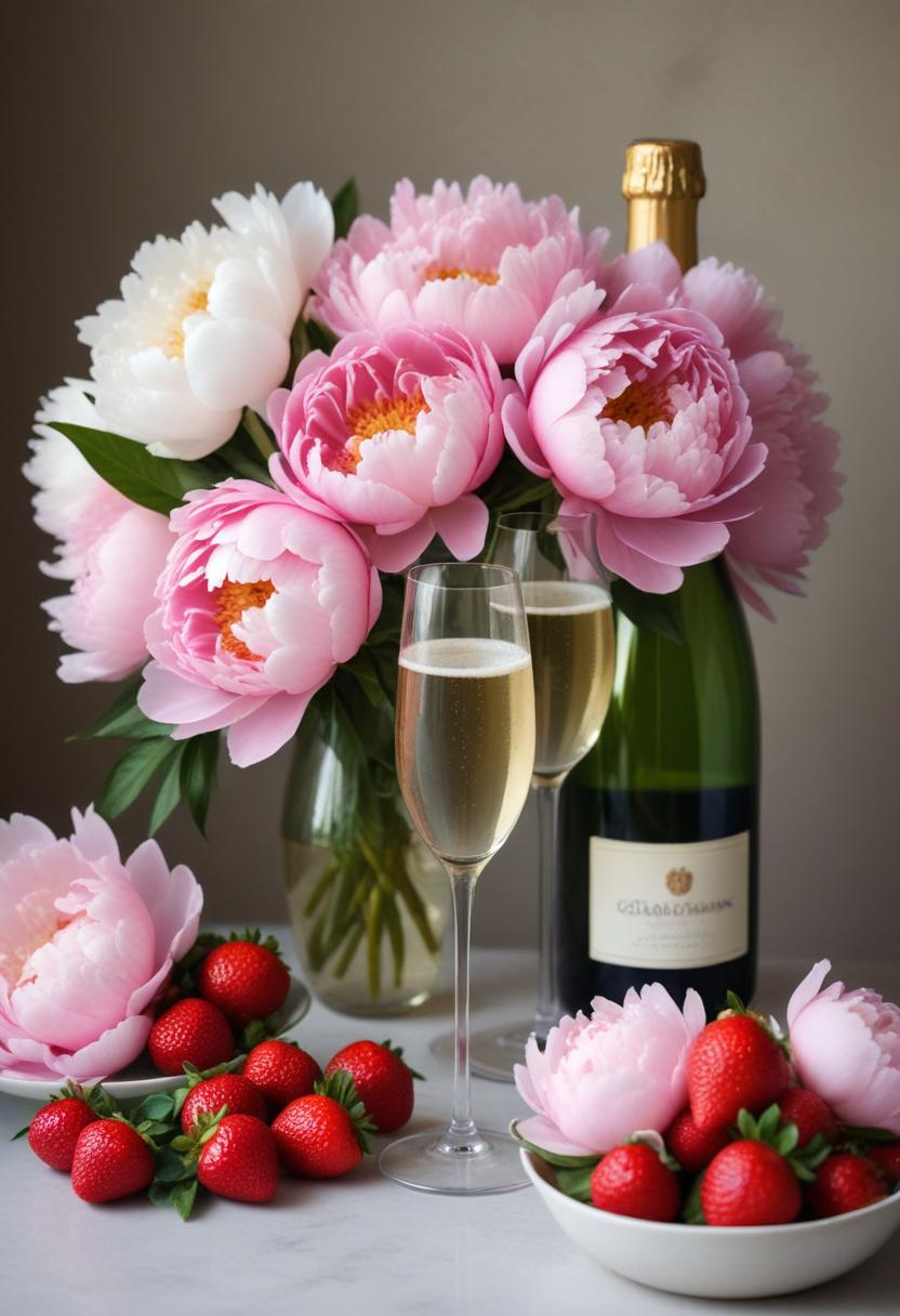 A beautiful arrangement of peonies in a vase sits beside champagne flutes and fresh strawberries, perfect for a celebration.