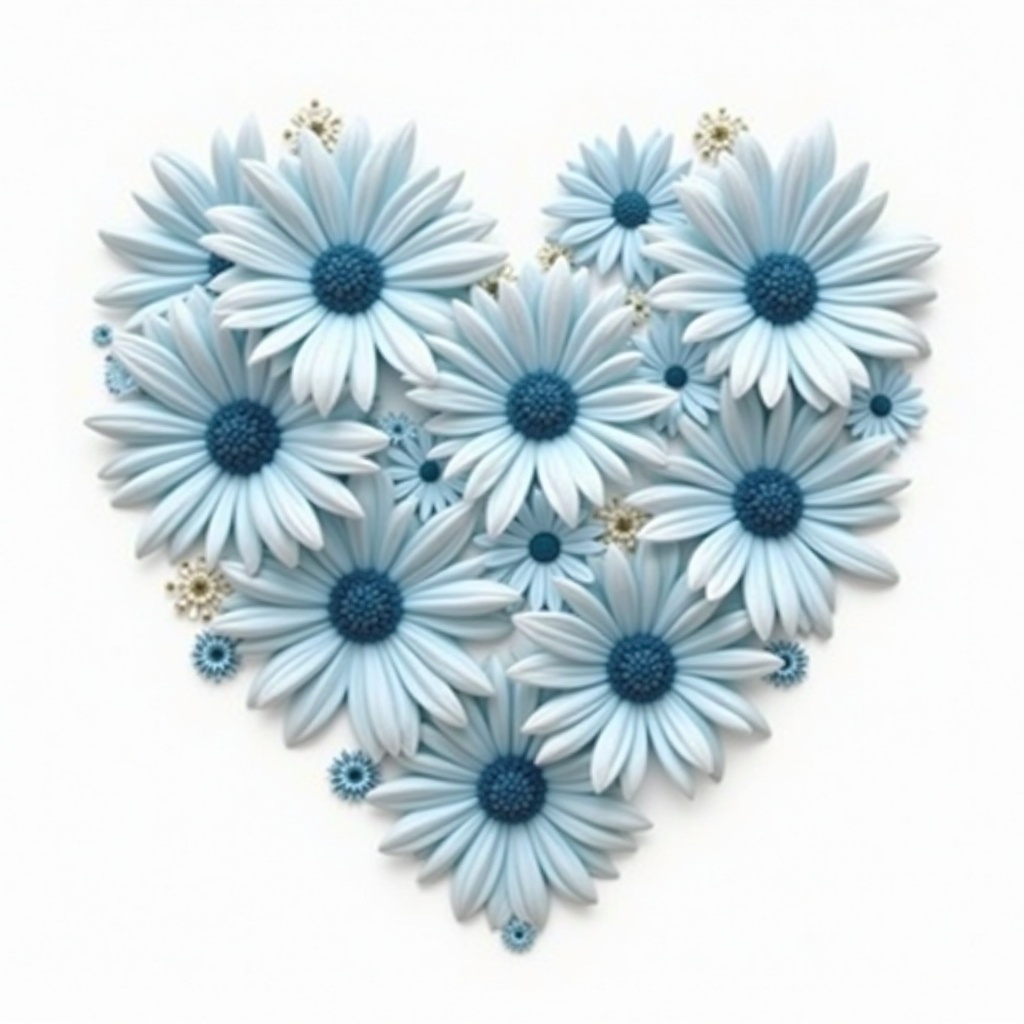 A heart-shaped arrangement of blue daisies is artistically decorated with small floral accents, creating a charming display.