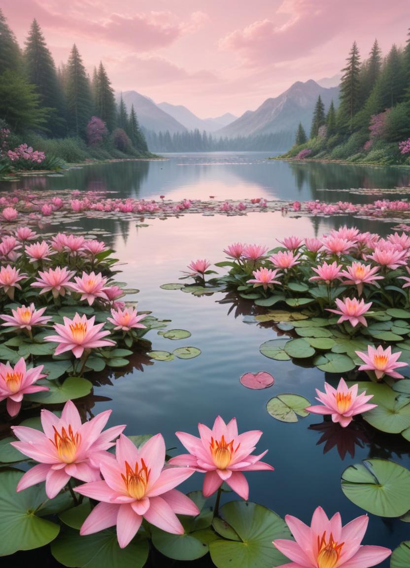 A tranquil lake reflects colorful lotus flowers at dawn, surrounded by lush trees and distant mountains under a pastel sky.