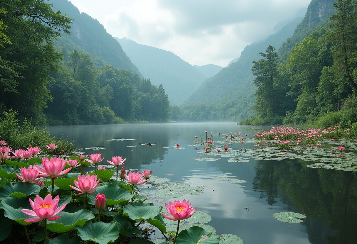 Serene lake surrounded by blooming lotus flowers