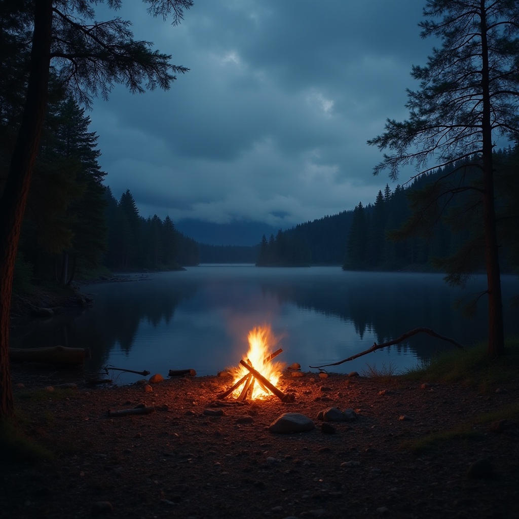A warm campfire flickers near a peaceful lake surrounded by tall trees. The dark sky is filled with clouds, creating a serene atmosphere.