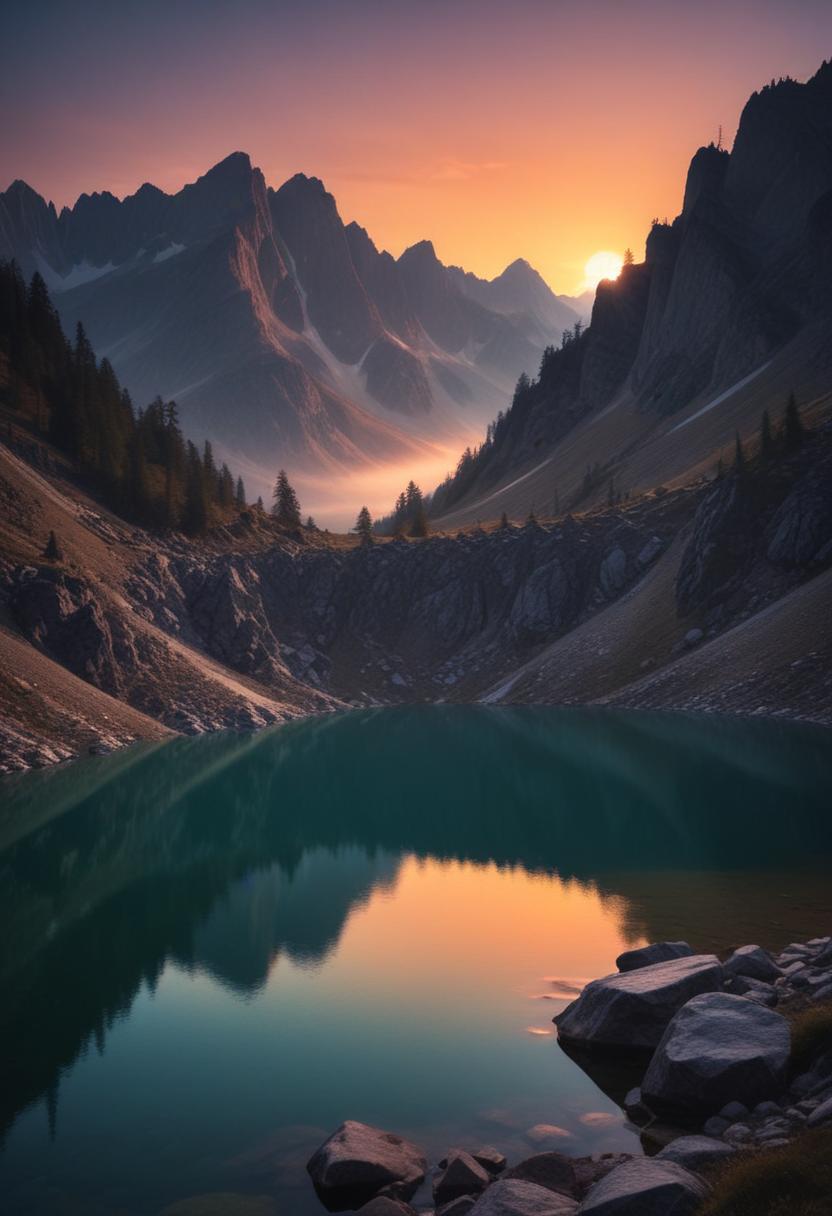 A serene mountain lake captures the vibrant colors of sunset, surrounded by towering peaks and lush greenery at dusk.