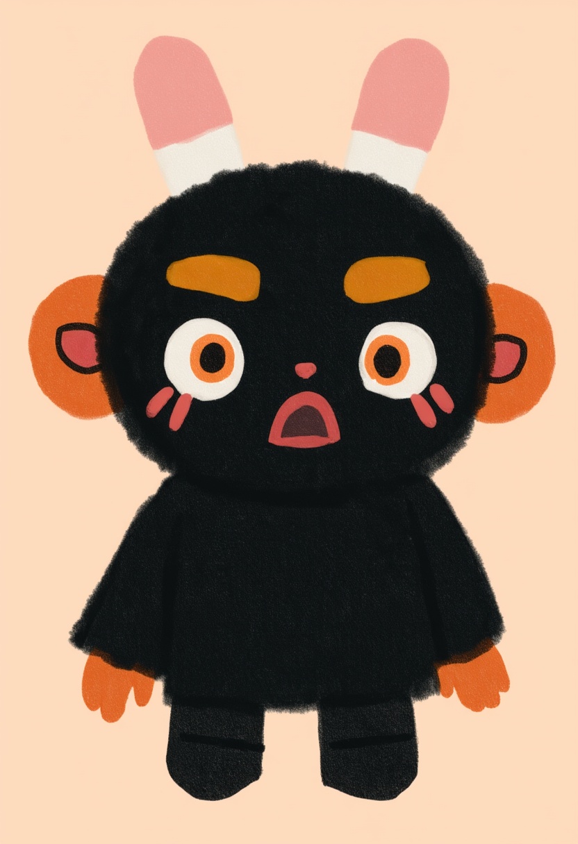 A whimsical character with rabbit ears and an astonished look stands against a light background, showcasing fun, playful design elements.