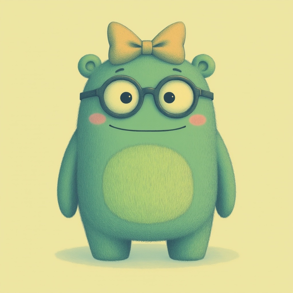 A charming green bear character stands smiling, wearing glasses and a yellow bow. Its friendly expression and round shape give a whimsical feel.