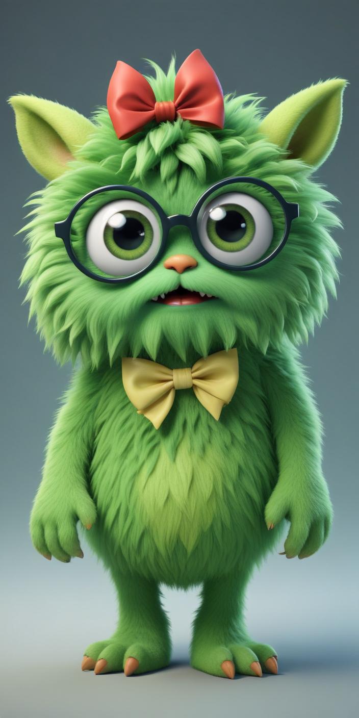 A fluffy green monster with big eyes, glasses, and a bowtie stands in a neutral setting, showcasing its cute and quirky personality.