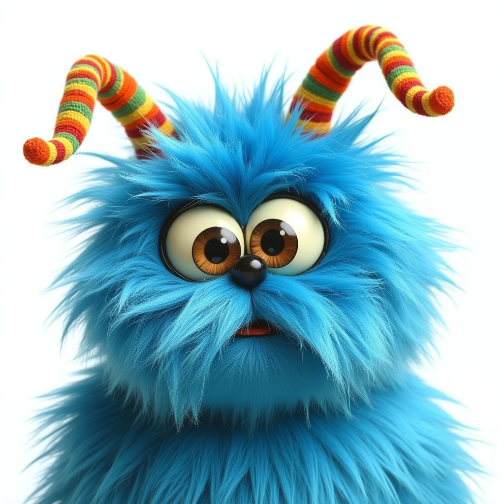 A playful blue creature with fluffy fur and vivid striped horns stands out against a plain background, showcasing its large eyes and expressive face.