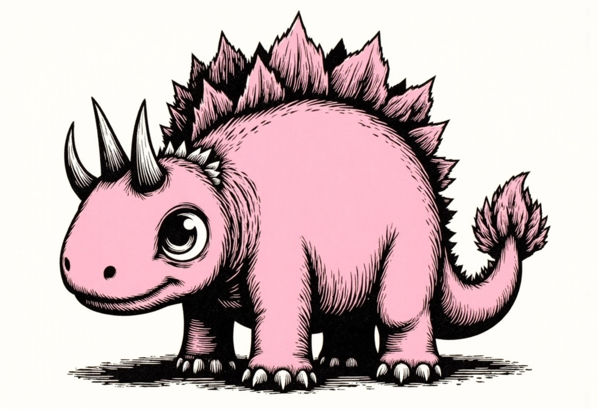 A playful pink dinosaur stands on all fours, featuring spiky protrusions and a friendly face, evoking joy in a whimsical setting.