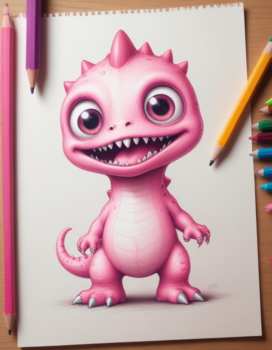 A colorful drawing of a playful pink dragon character with big eyes, sharp teeth, and a friendly expression on white paper.