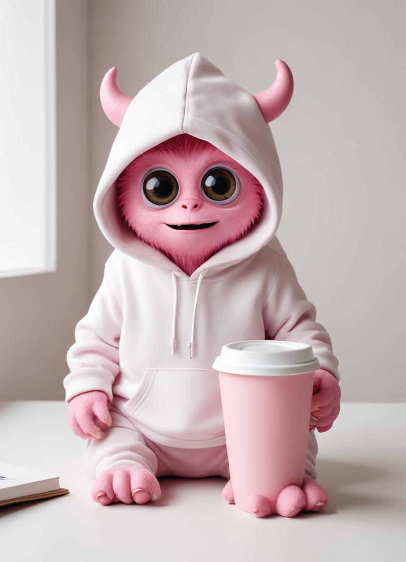adorable, cartoon style, character art, character design, charming, coffee cup, cozy, cozy atmosphere, cute creature, fantasy creature, friendly, hoodie, imaginative, indoor setting, pink monster, playful, plush, soft toy, whimsical, whimsical design