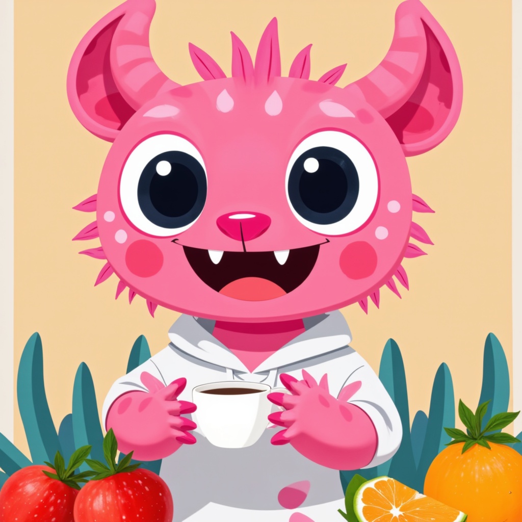 A cheerful pink monster character in a white hoodie holds a cup surrounded by fresh fruit, showcasing a playful and inviting atmosphere.
