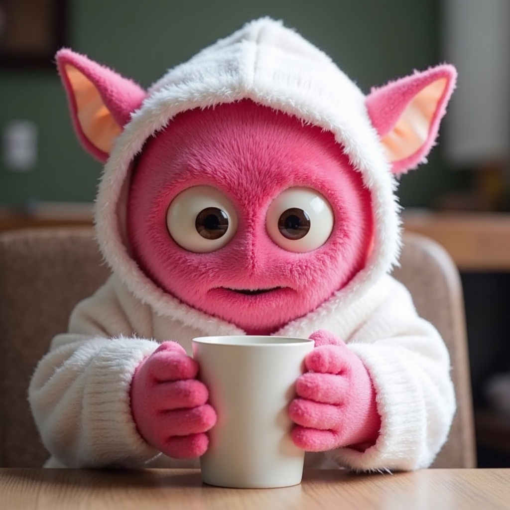 A fluffy pink creature in a white hoodie sits at a table, cradling a mug warmly.