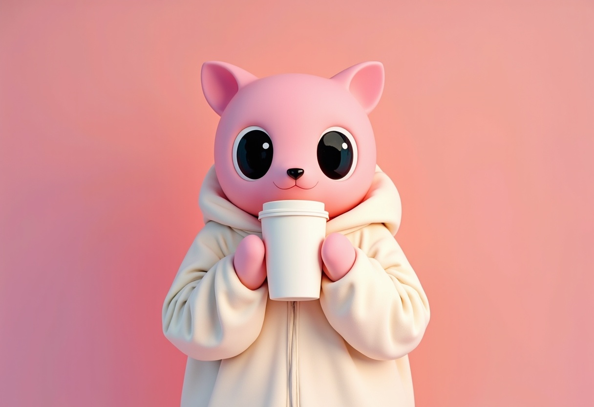 A playful pink cat character in a cozy hoodie enjoys holding a coffee cup against a pastel background, radiating a cheerful vibe.