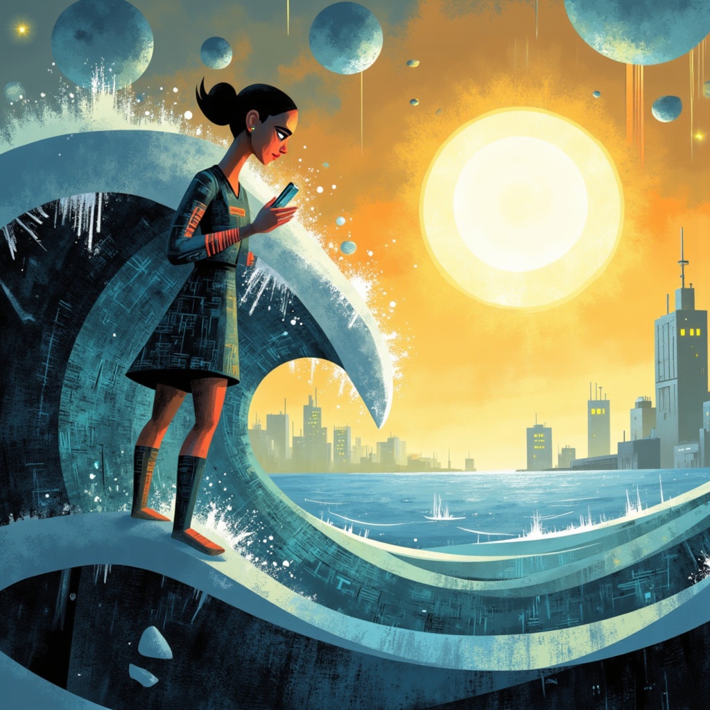 A girl in a stylish outfit stands on a cresting wave, absorbed in her phone, as a vibrant sunset and city skyline form a dramatic backdrop.