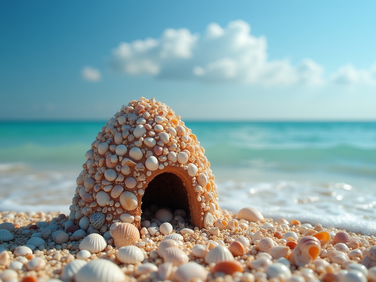 A unique structure made of seashells sits on a sandy beach, waves gently rolling in under a bright blue sky with a few clouds.