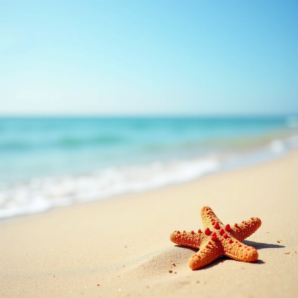 Bright starfish rests on soft sand as gentle waves roll in under a clear sky. The tranquil beach scene captures a moment of coastal beauty.