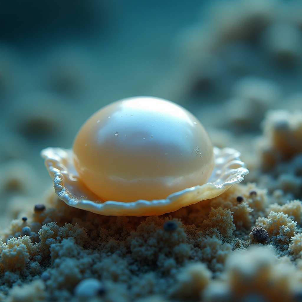 A lustrous pearl rests inside a delicate shell on the sandy ocean floor, illuminated by soft, natural light, creating a serene underwater ambiance.