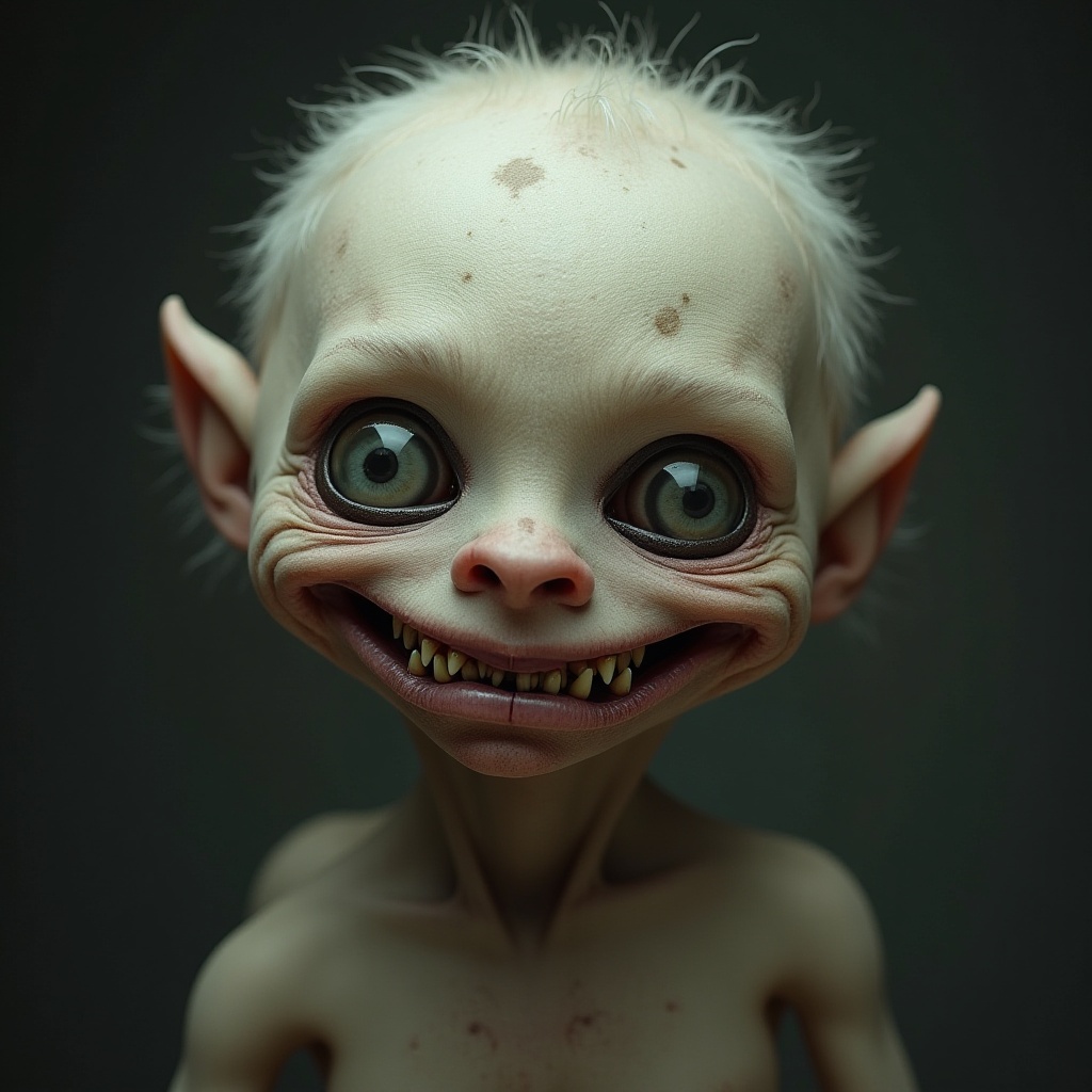 3D render, bald head, dark background, digital art, eerie face, elf, fantasy illustration, fantasy monster, fictional being, ghostly pale, goblin, green eyes, grinning, horror art, illustration, large eyes, monstrous grin, pale skin, pointy ears, sharp teeth, sinister smile, ugly creature, white hair, wrinkled face, yellow teeth, creepy creature