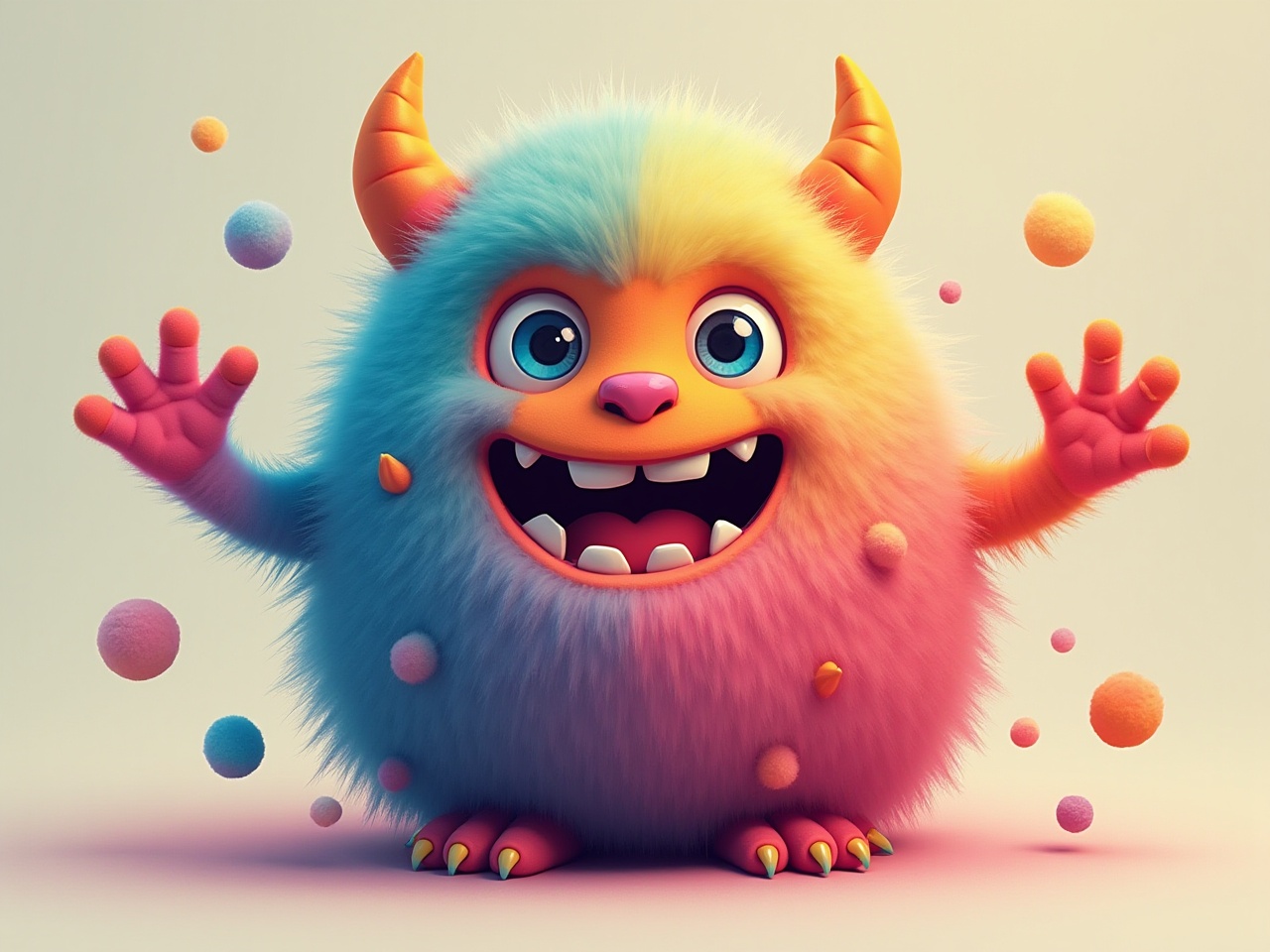A cheerful monster with colorful fur and big eyes stands with arms raised, surrounded by colorful floating spheres in a whimsical design.