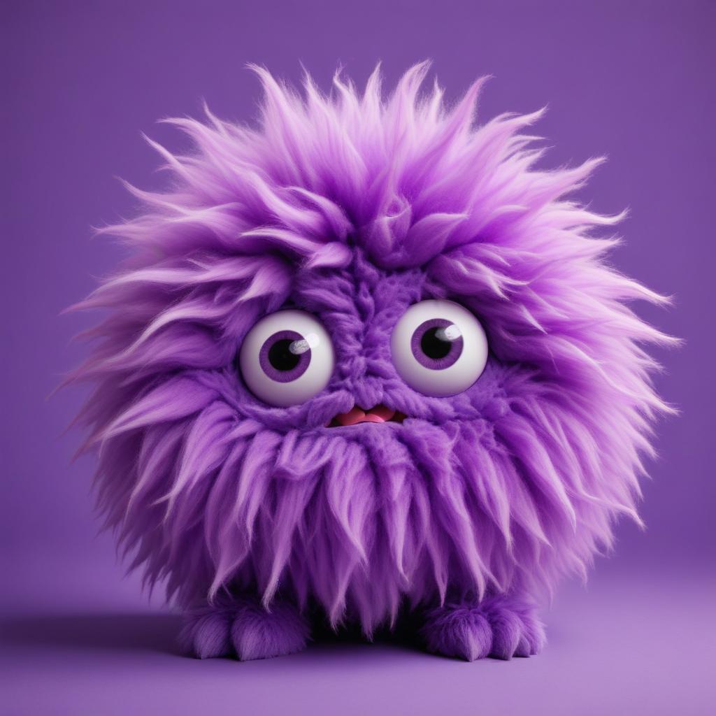 A small, fluffy purple creature with large expressive eyes sits on a solid background, exuding a cute and whimsical charm.