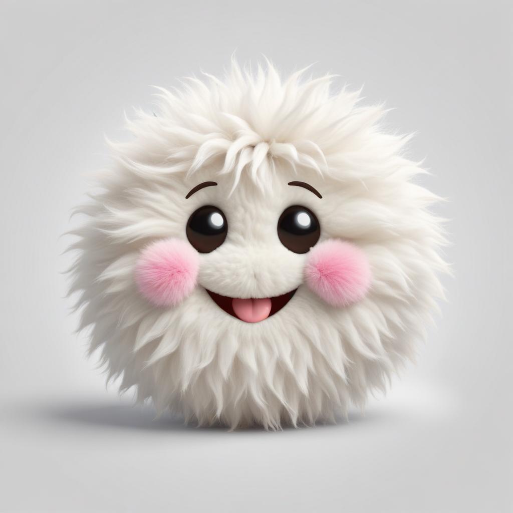 3D render, adorable, animal character, big eyes, blush, cartoon, cute, emoticon, fun, furry ball, gray background, grinning mouth, happy face, illustration, isolated, kawaii, mascot, pink cheeks, plush toy, round creature, smiling, soft fur, sparkly eyes, whimsical, white fur, fluffy animal