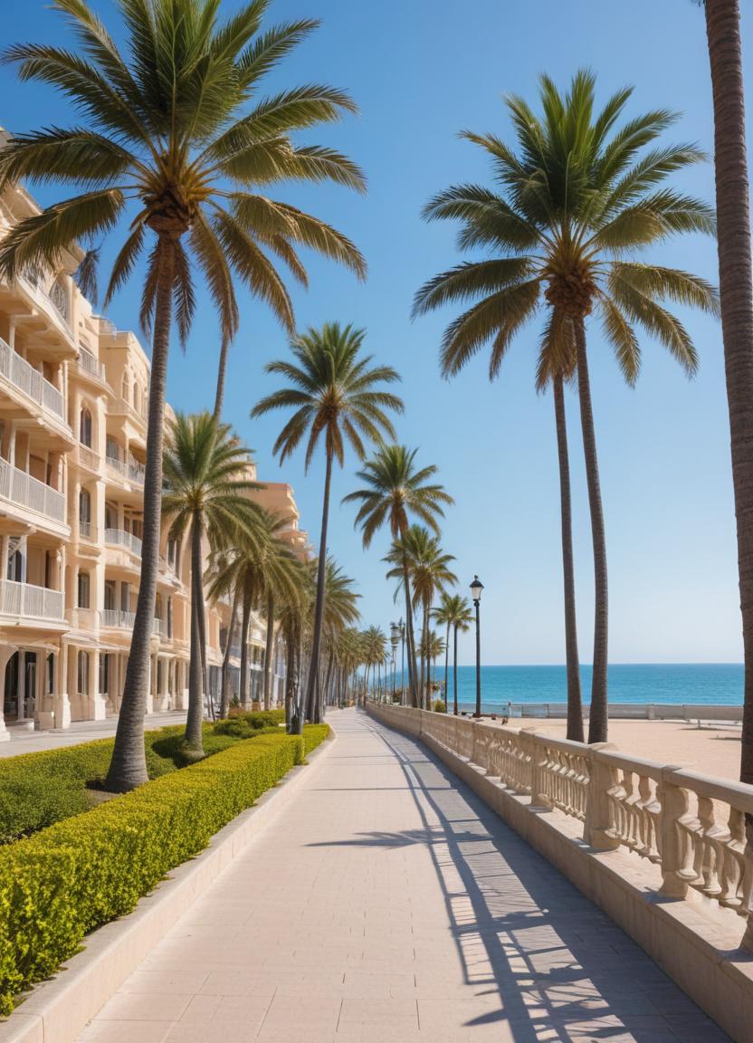 architecture, beach, clear sky, coastal living, coastal walkway, greenery, landscape, leisure, ocean, palm trees, promenade, relaxation, scenic view, seaside, summer, summer day, sunlight, travel, vacation, vivid colors