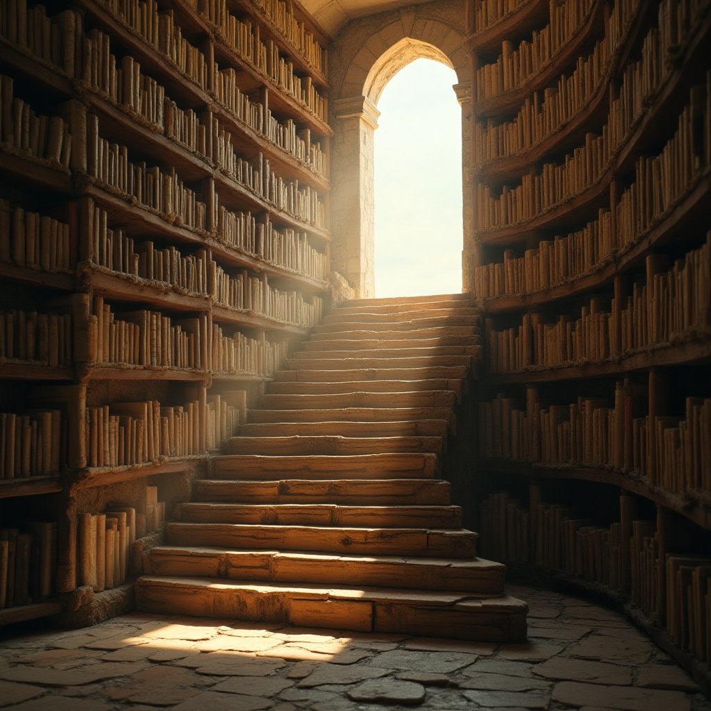 adventure, ancient, architecture, archway, atmosphere, books, culture, discovery, history, illuminated, knowledge, library, mystical, quiet, reading, shelves, stairs, stone, study, sunlight