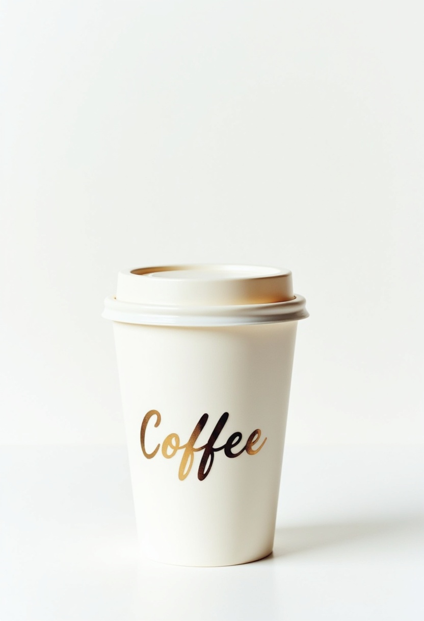 A takeout coffee cup featuring elegant lettering rests on a smooth surface, highlighting its simple yet appealing design.