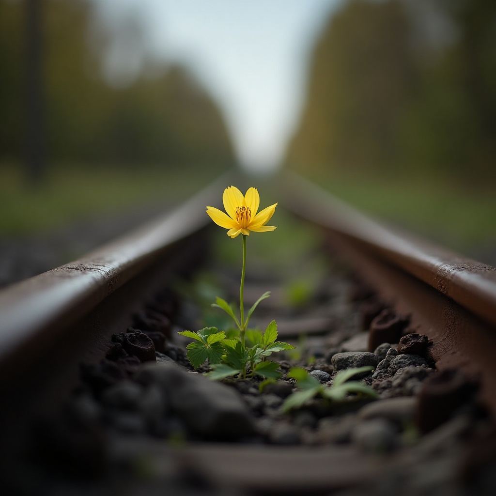 A bright yellow flower emerges from the gravel along railway tracks surrounded by lush greenery, showcasing nature's resilience against industry.