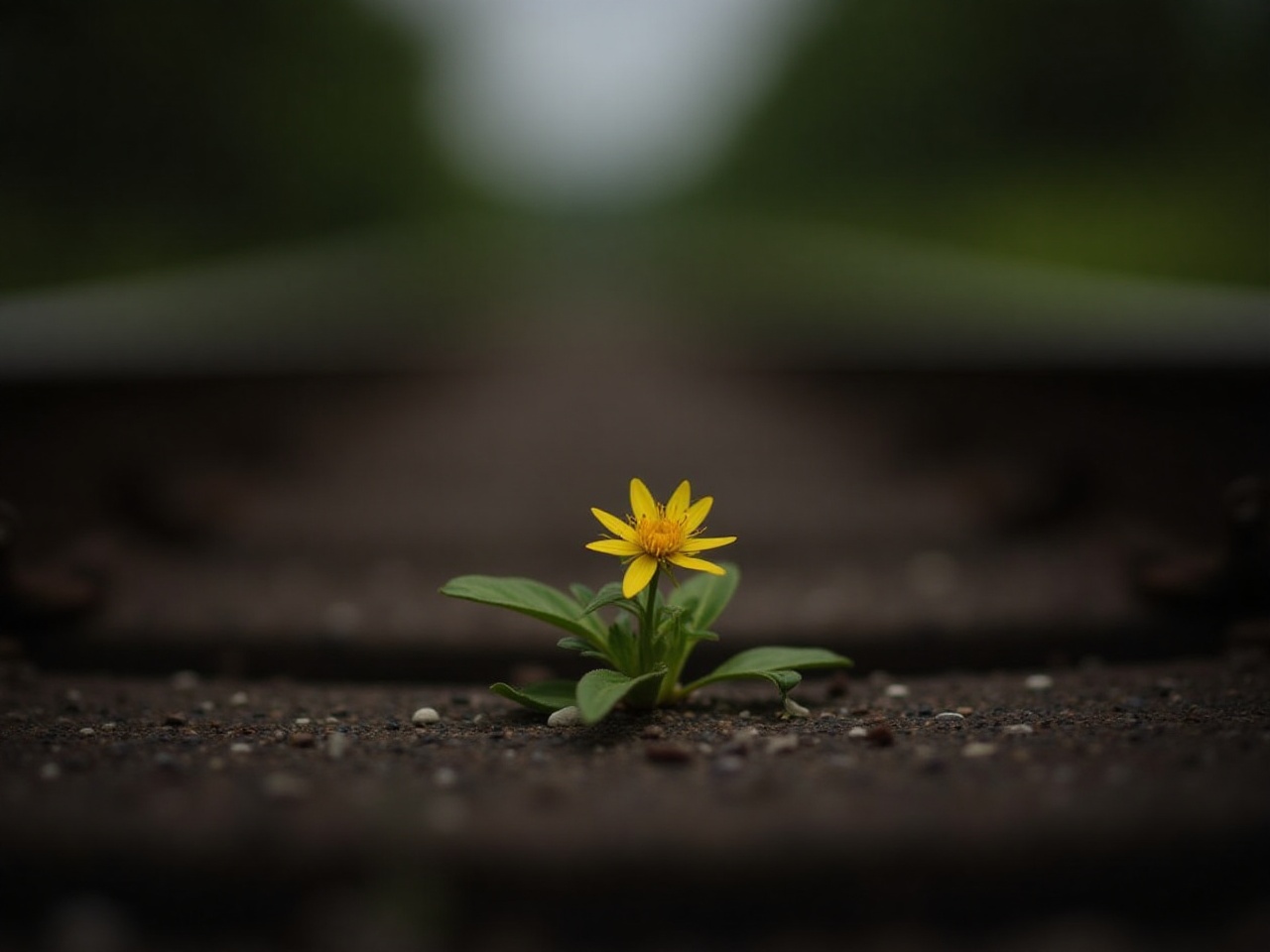 A bright yellow flower emerges from gravel on train tracks, showcasing resilience in a deserted environment during the early morning.