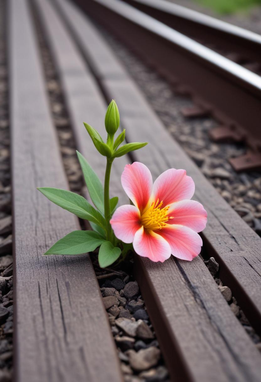 A delicate pink flower emerges from the wooden railroad tracks surrounded by gravel, showcasing nature's resilience in an urban landscape.