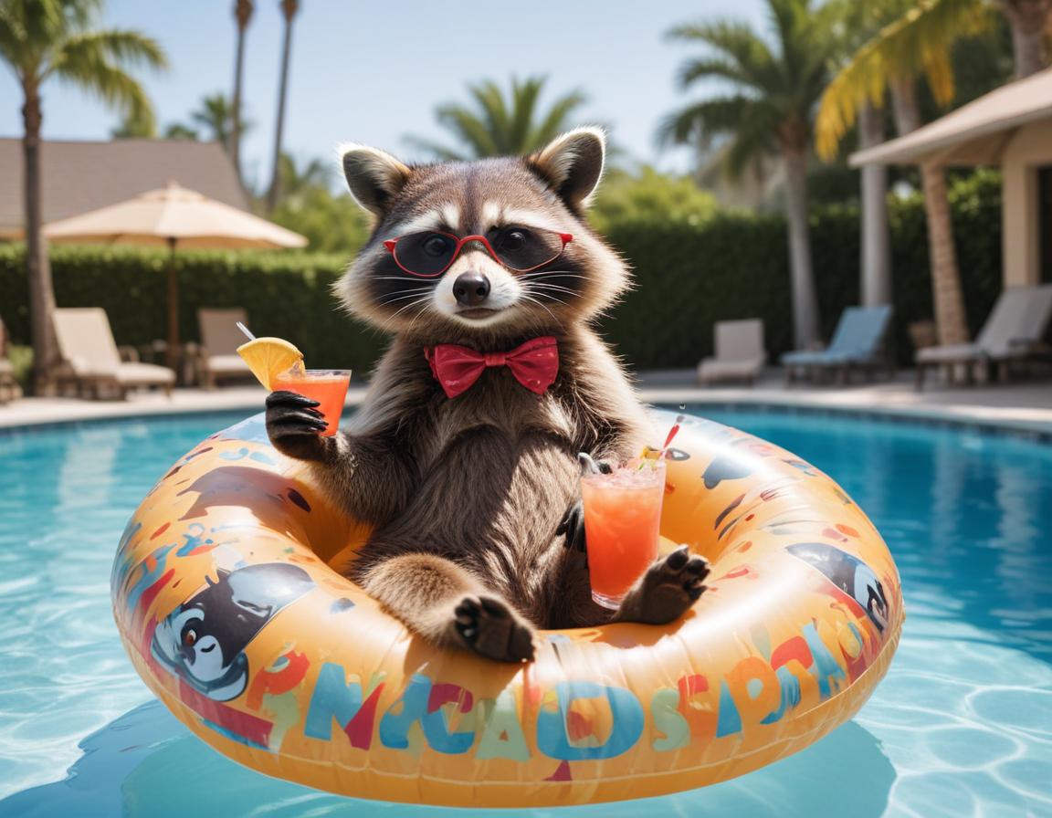 A raccoon wearing sunglasses and a bow tie relaxes in an inflatable ring, sipping colorful drinks by a sunny poolside.
