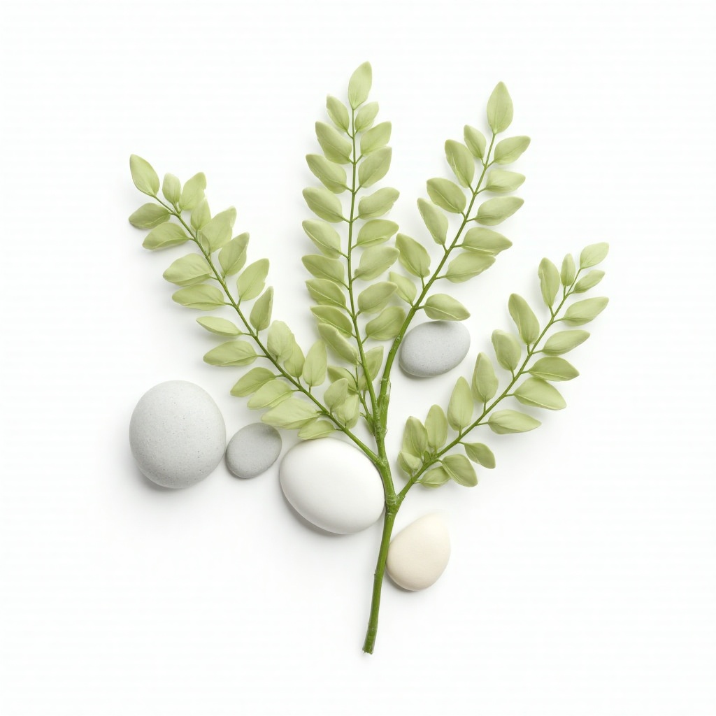 Delicate green leaves lie next to smooth, round stones in a simple and elegant design, showcasing nature's beauty.