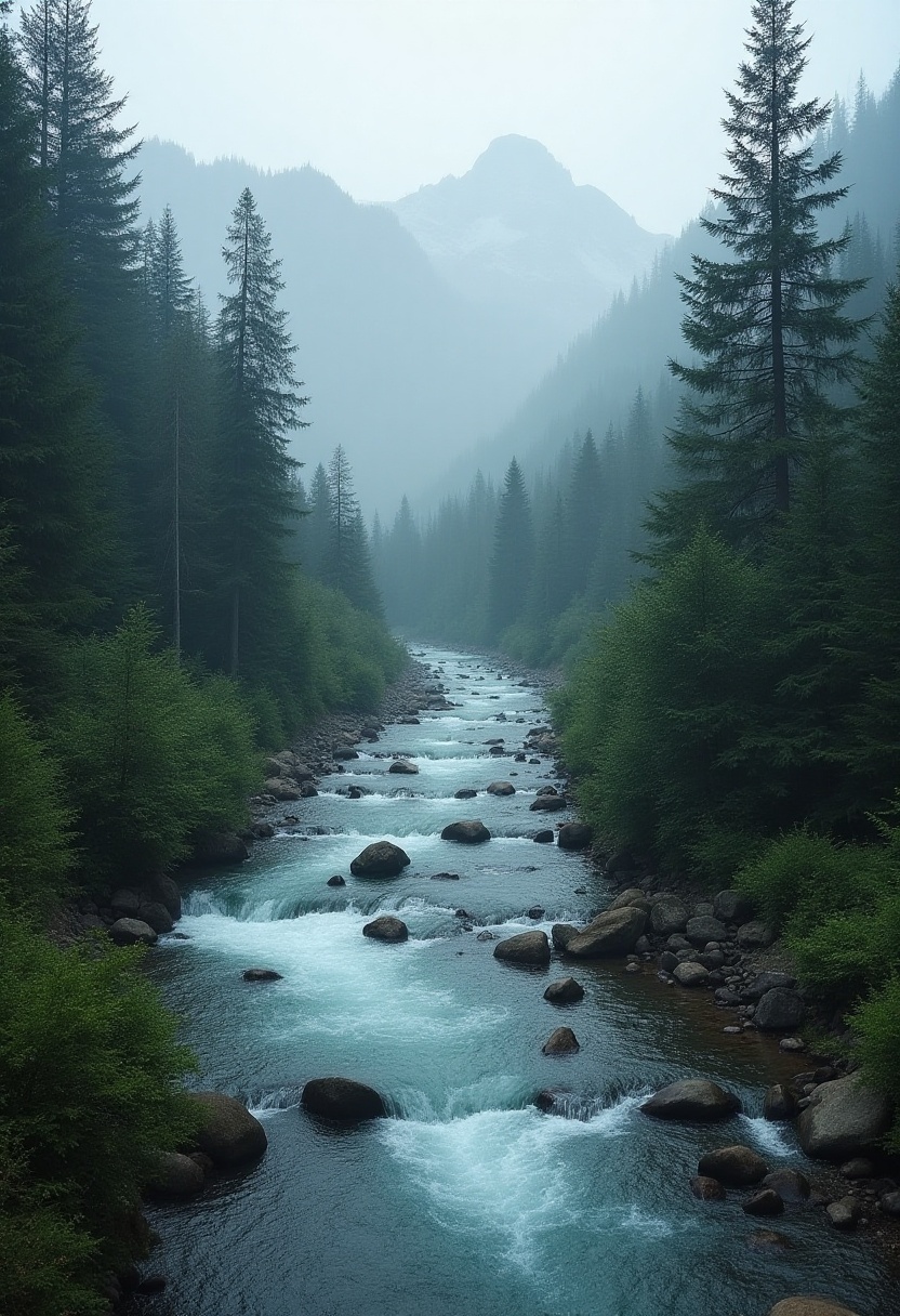 A tranquil river winds through a foggy valley, surrounded by tall trees and distant mountains, creating a serene natural landscape.