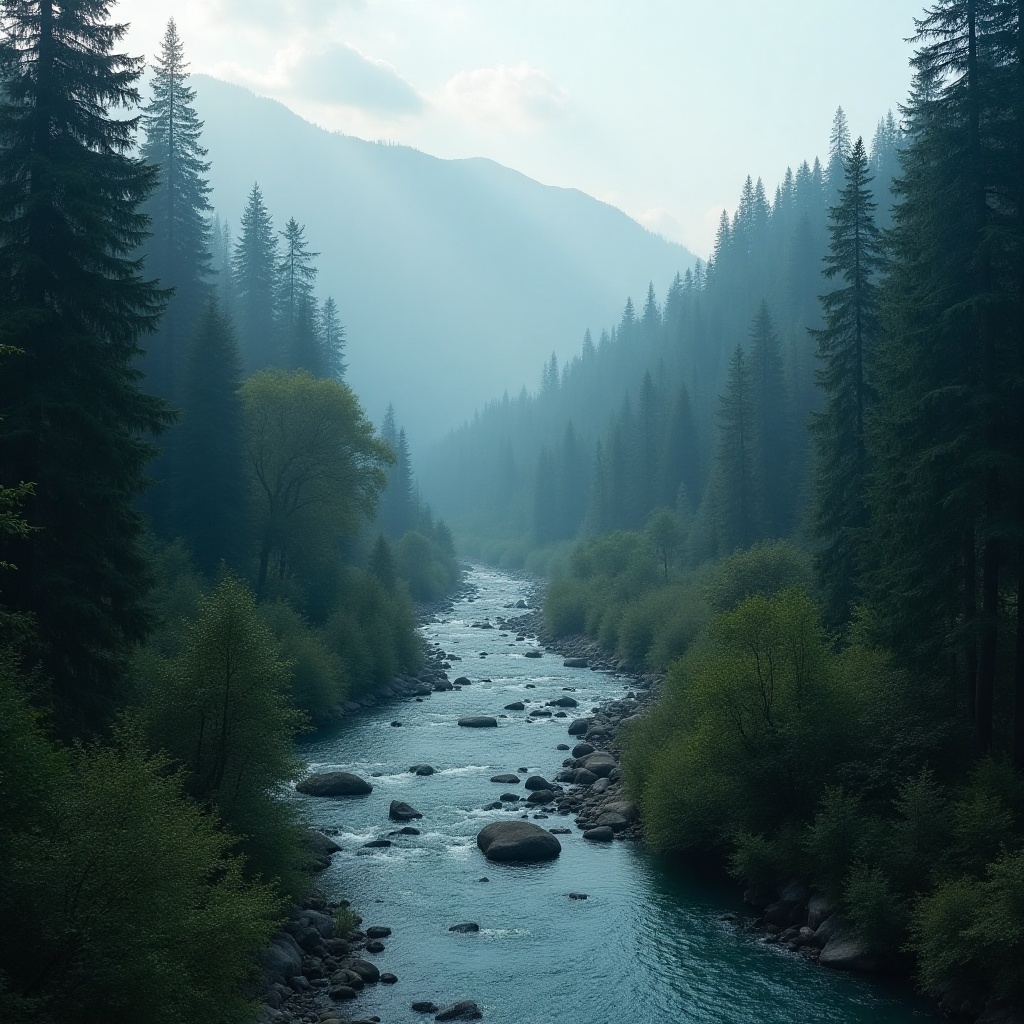 A winding river flows gently through a tranquil forest of tall evergreens, surrounded by misty mountains under soft light.