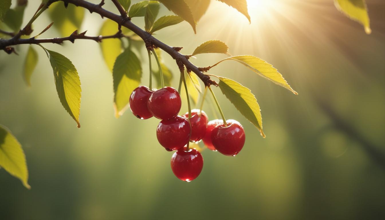 Bright red cherries cling to a tree branch, illuminated by soft sunlight filtering through leaves during late afternoon.