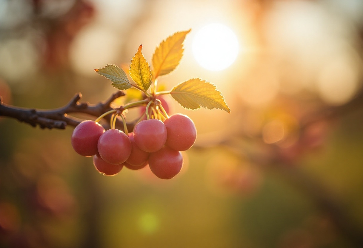 Ripe cherries dangle from a branch as the golden sunlight bathes them, creating a warm and inviting atmosphere in the orchard.