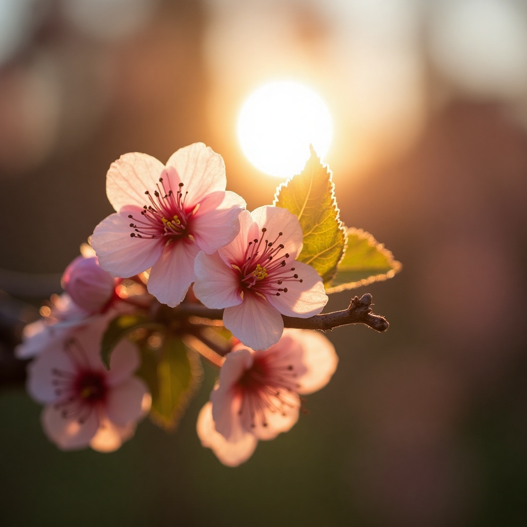 beauty, bloom, blossom, botanical, branch, cherry blossoms, evening, flora, flowers, garden, landscape, nature, outdoor, petals, pink, serenity, spring, sunlight, sunset, tranquil