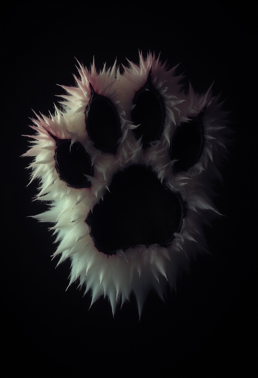 A close-up of a fluffy animal paw shows its unique texture and shape against a dark background, highlighting its intricate details and softness.