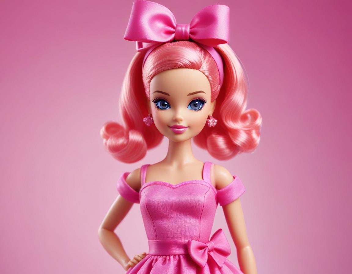 A doll with pink hair and a pink dress stands in a playful pose against a bright background, showcasing her cheerful expression and style.