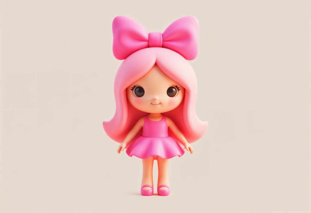 A charming doll with pink hair and a large bow stands in a neutral setting, ready for imaginative play.