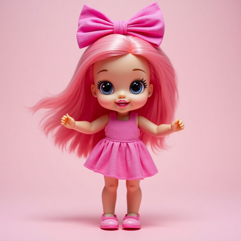 A charming doll stands cheerfully with pink hair and a matching dress, set against a soft pastel backdrop, showcasing vibrant colors.