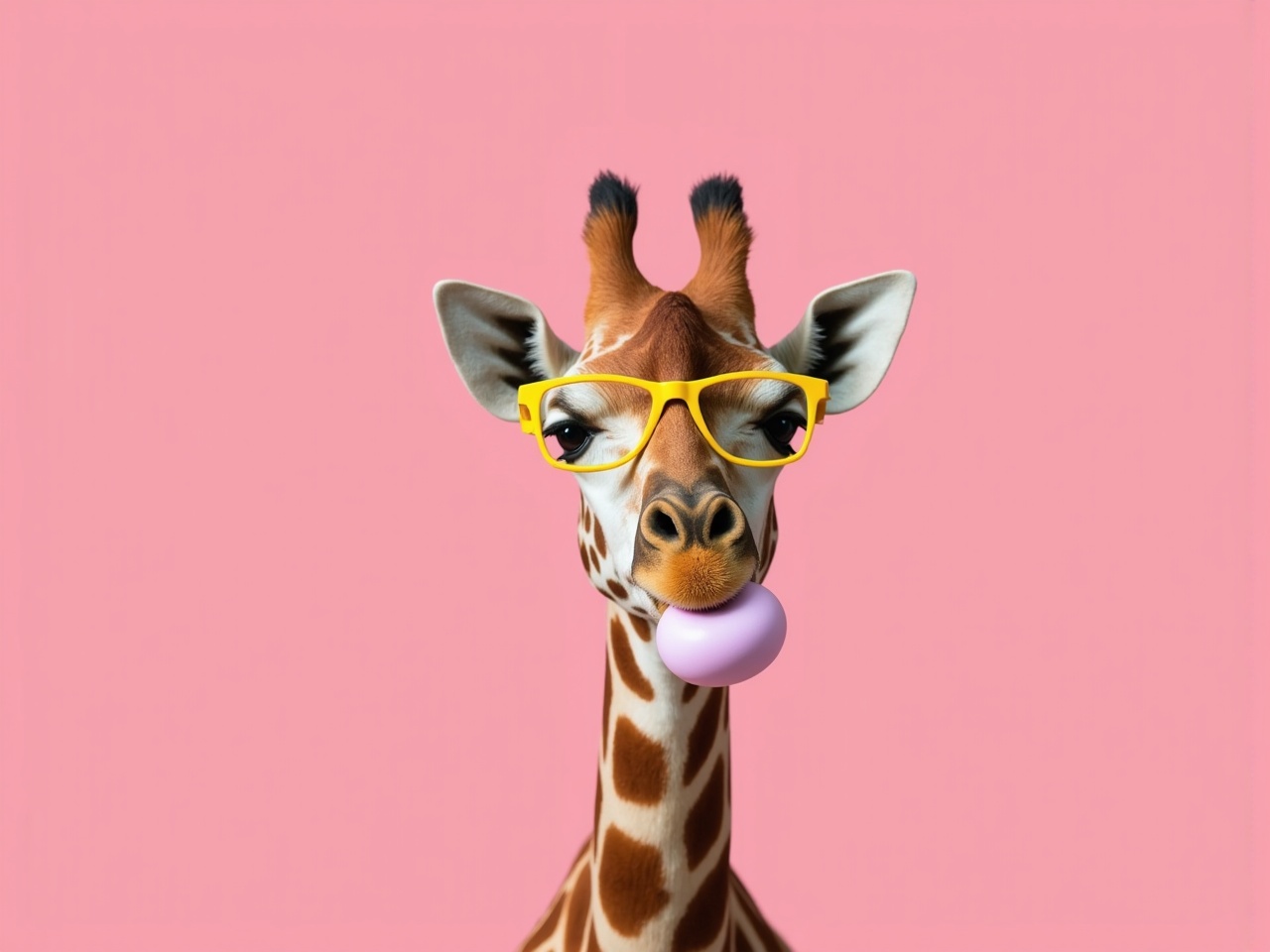 A giraffe wearing bright yellow glasses blows a bubble with gum against a pink background, showcasing a playful and whimsical atmosphere.