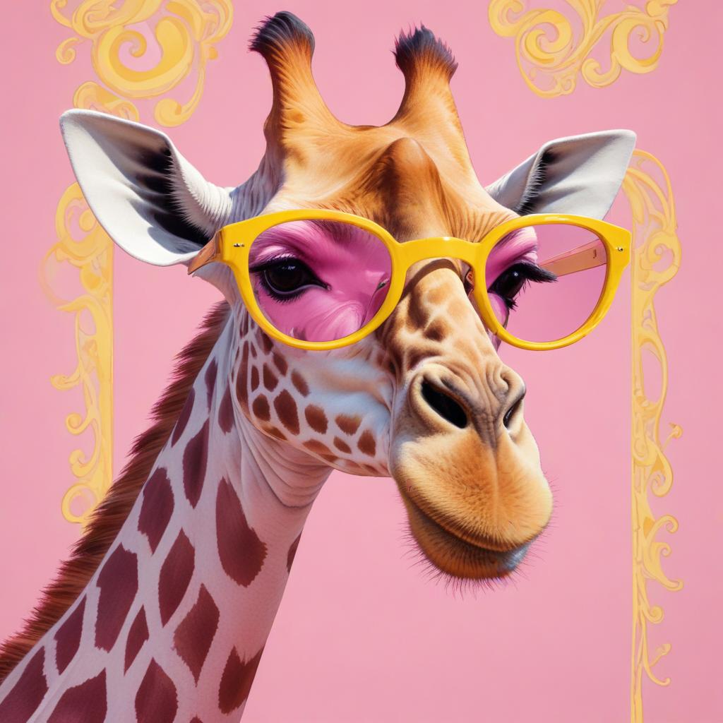 A giraffe with colorful glasses poses playfully against a pink background. Its curious expression adds charm to the lively atmosphere.
