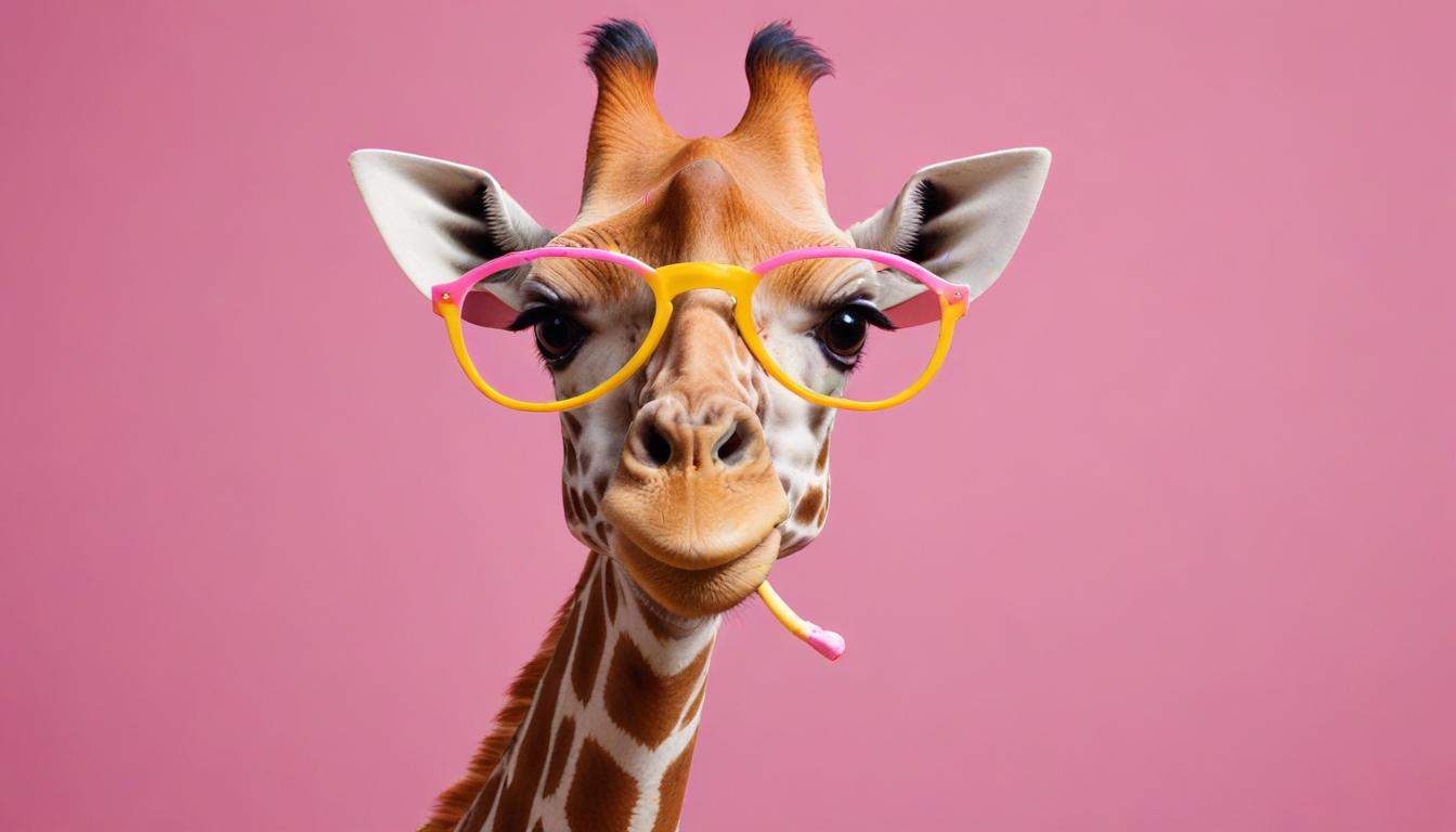 A giraffe poses playfully in oversized glasses against a vibrant pink background, creating a whimsical and lighthearted atmosphere.