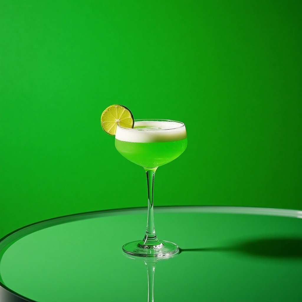 A vibrant green cocktail with a lime slice sits elegantly on a glossy surface, set against a bright green background, exuding freshness.