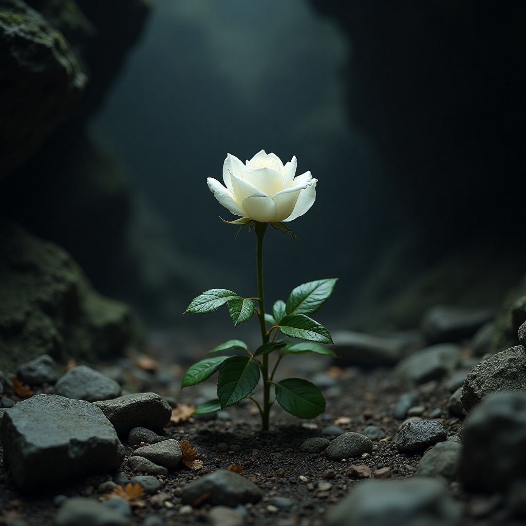 A single white rose stands tall amidst dark rocks in a serene, shadowy environment, showcasing nature's beauty and resilience.