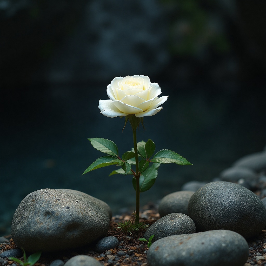 White rose growing beside stones in a tranquil setting