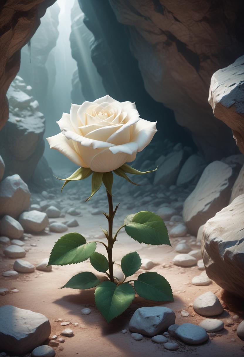 A stunning white rose grows in the center of a rocky cave, illuminated by soft light from above, creating a serene atmosphere.