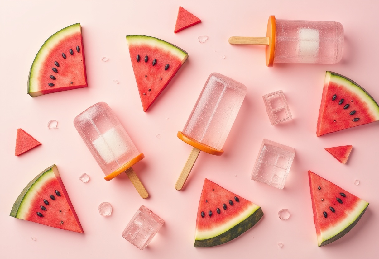 aesthetic, bright, cold, colorful, dessert, food styling, fruit, ice cubes, juicy, party, picnic, pink background, playful, popsicles, refreshing, sliced, summer, sweet, treat, watermelon